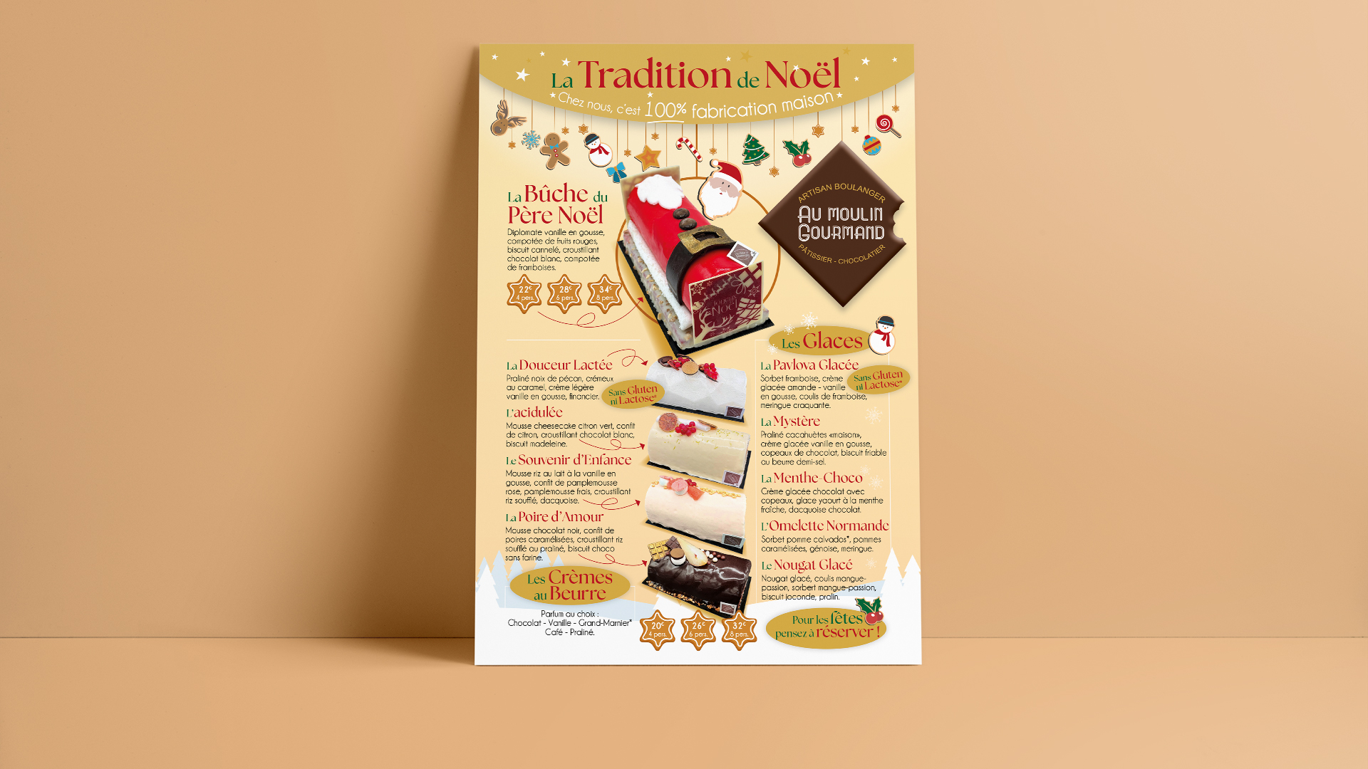 Création de la carte de Noël. Salé, sucré, bûches, glaces et gourmandises, à déguster sans modération