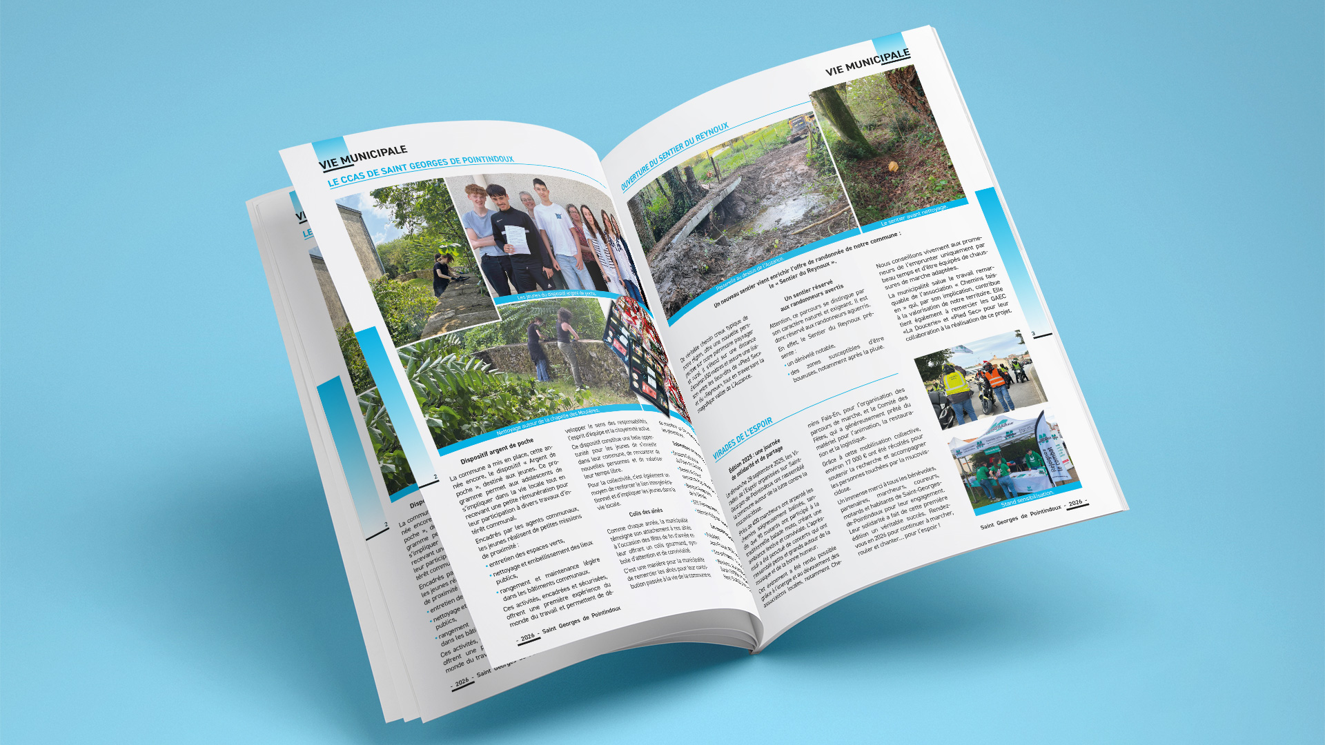 La mairie me confie la réalisation de ses bulletins municipaux, 2 par an : prolongation de la charte graphique, enrichissement des textes fournis et travail sur les visuels.