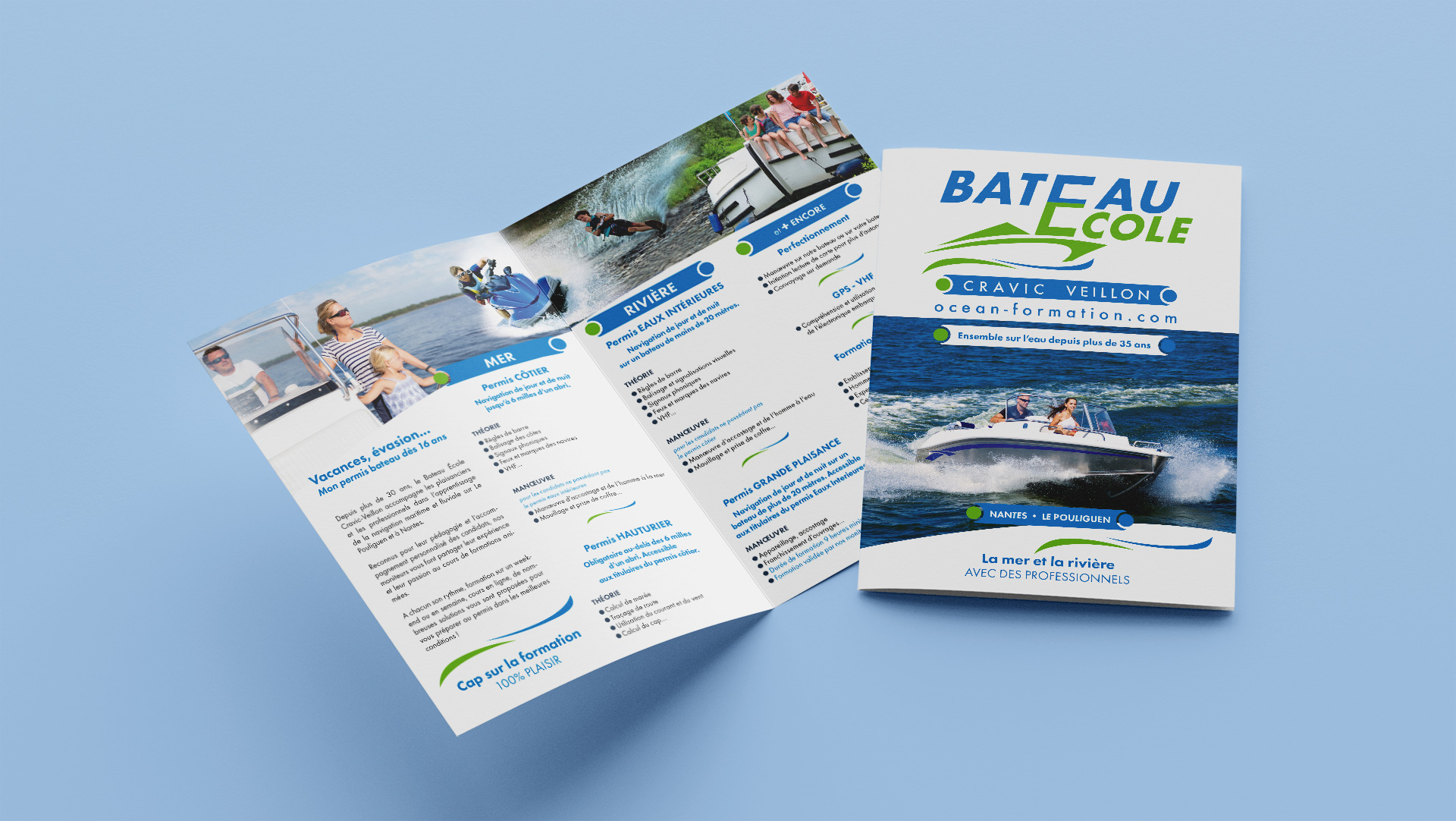 Dépliant de présentation du bateau-école avec des permis pour la mer, la rivière et plus encore